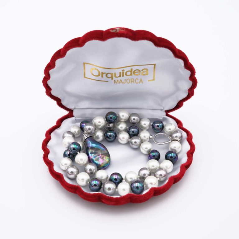 Notre collier en perles de Majorque est composée de perles d’un diamètre de 12 mm avec une jolie harmonie de trois couleurs : blanches, grises et pétroles.