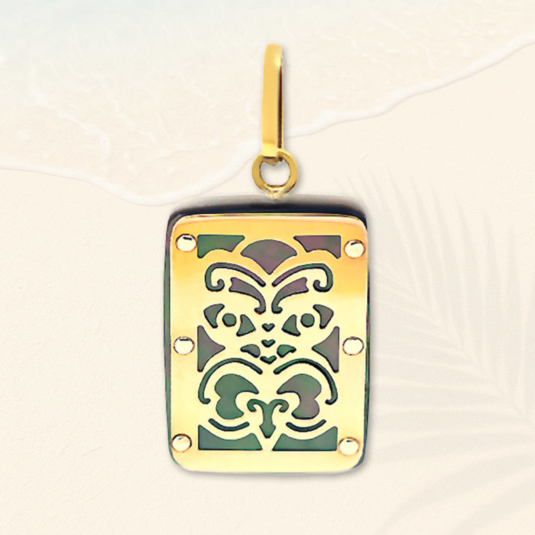 Pendentifs Tiki en or 18K et nacre de Tahiti. Symboles polynésiens de force et protection, alliant éclat précieux et tradition ancestrale.