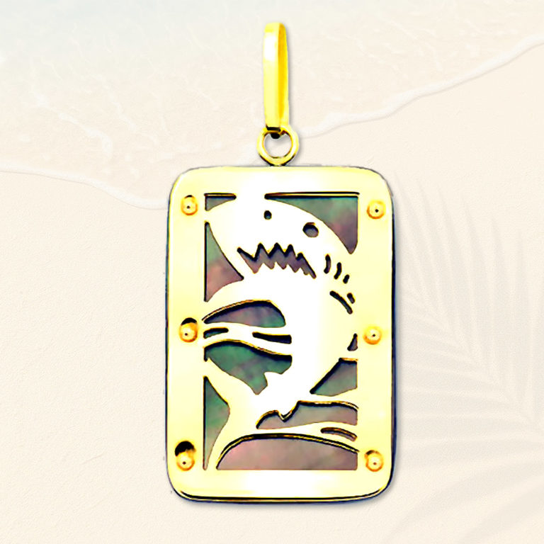 Ce pendentif en or 18K et nacre de Tahiti évoque le requin, gardien des océans et emblème de puissance dans la culture polynésienne.